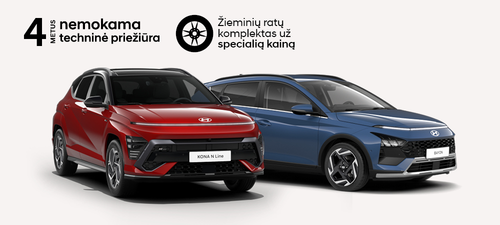 Akcija galioja tik „Hyundai BAYON Cross“ su „Comfort“ įranga ir KONA hibridui su „Premium“ įranga, užsakytiems iki 2026 m. kovo 31 d.
