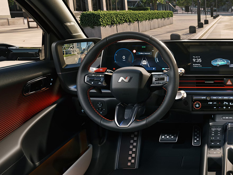 Sportinės sėdynės turi „N Line“ ženklą, raudonų dygsnių siūles ir raudonus siūlių apvadus. Užvedimo mygtukas ir vėdinimo angos taip pat išryškintos raudonu apvadu, o garsiakalbio duryse tinklelis juodas.